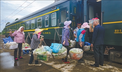 The No. 5652/1 passenger train runs daily between Kunming in Yunnan and Hongguo in Guizhou. It is a charity "slow train." On July 19, at Wuguantian Railway Station in Malong district, Qujing city, Yunnan, villagers boarded the train preparing to go to the urban area to sell agricultural products.