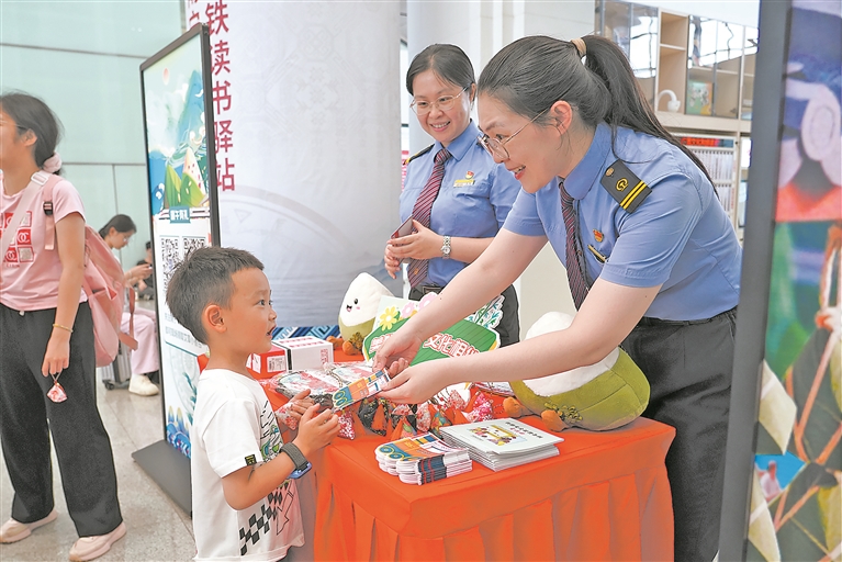南寧東站工作人員向小朋友贈送艾草香包和鐵路文明出行折頁(yè)。梁競輝 攝